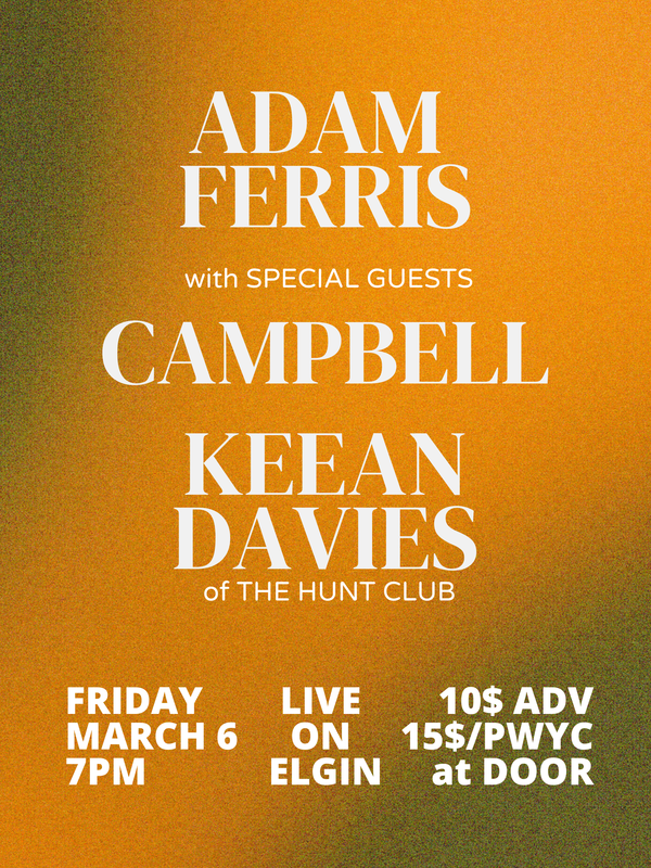 Adam Ferris is a singer-songwriter who writes catchy songs that make you feel fuzzy on the inside. With honest and heartfelt lyrics and a melodic voice, Adam’s catalogue of songs about living life on life’s terms conveys pain and hope all at once. Blending alternative, punk, and folk influences with an always intimate and memorable live performance, Adam Ferris is a talent not to be missed.