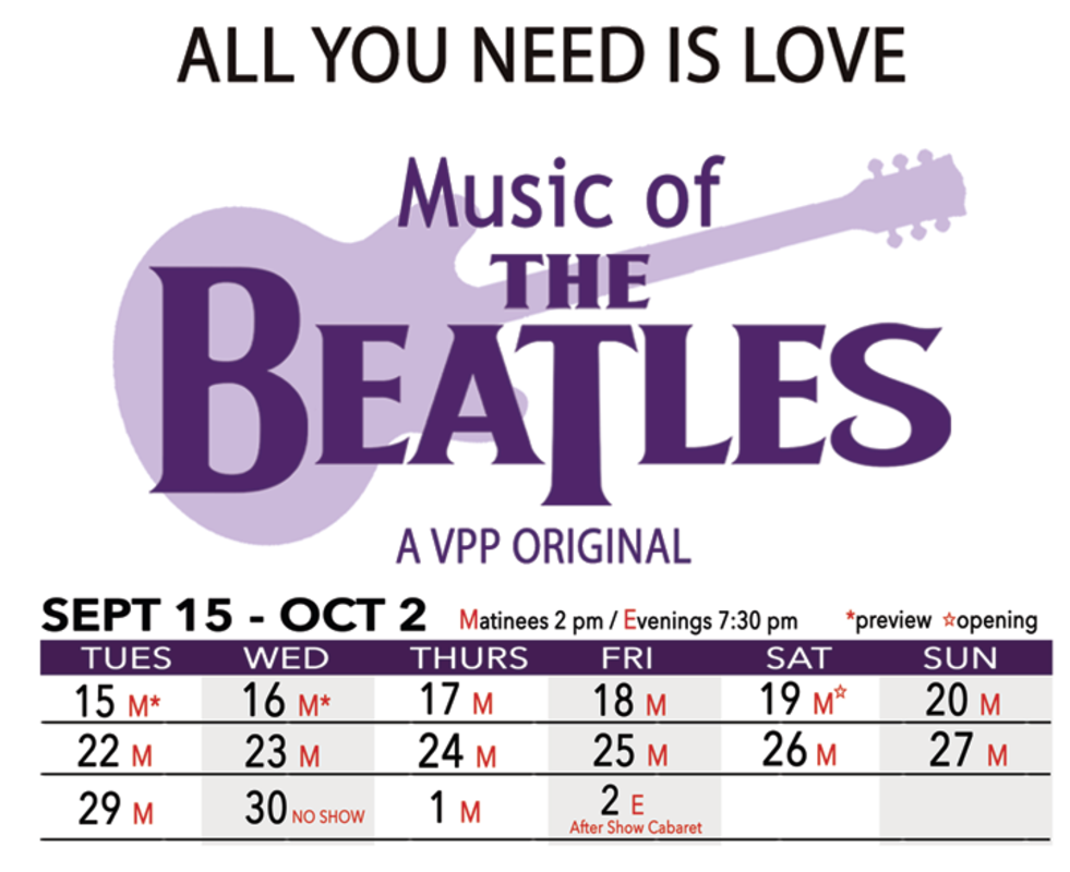 we step back again into the golden age of pop, as we celebrate the unforgettable Beatles catalogue and their songs that changed the world! From the early days of She Loves You and I Want to Hold Your Hand to the revolutionary sounds of Sgt. Pepper, Abbey Road, and Let It Be, this show is bound to be another VPP knockout!