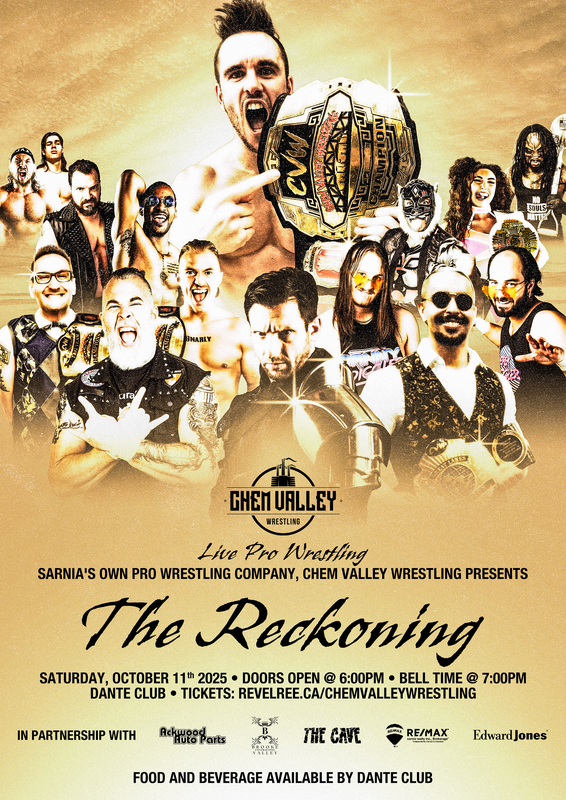Doors at 6PM. Event Starts 7PM!!! Chem Valley Wrestling Presents: The Reckoning - Live Pro Wrestling in Sarnia, Ontario. Featuring 3 exciting championship matches, local debuts and returning favourites, including a surprise return. Sarnia wrestler Lucian Leblanc makes his Sarnia in-ring debut in a tag team match against the Double D's. Leblanc's partner is a mystery surprise return! CVW Women's Champion Miley will be on hand, as well as Heavyweight Champion Bhupinder Gujjar, Tag Team Champs Books and Looks, Pretty Ricky Willdy, Evil Soultaker, Tyler Tirva and so many more!